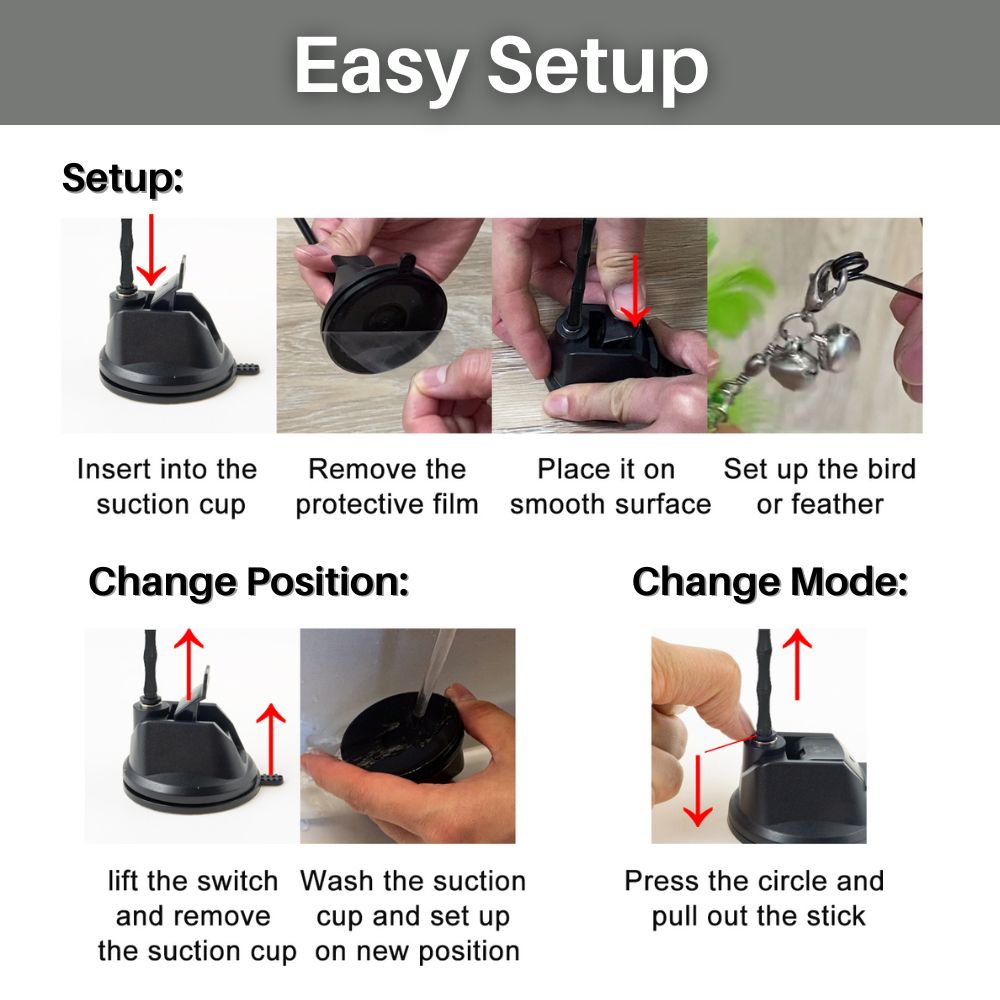 The Feather Frenzy™ is easy to use, with a 360° rotating tangle-free design. This ensures the safety of your pet during play and allows for easy attachment of replacement toys, promoting long-term use and enjoyment.